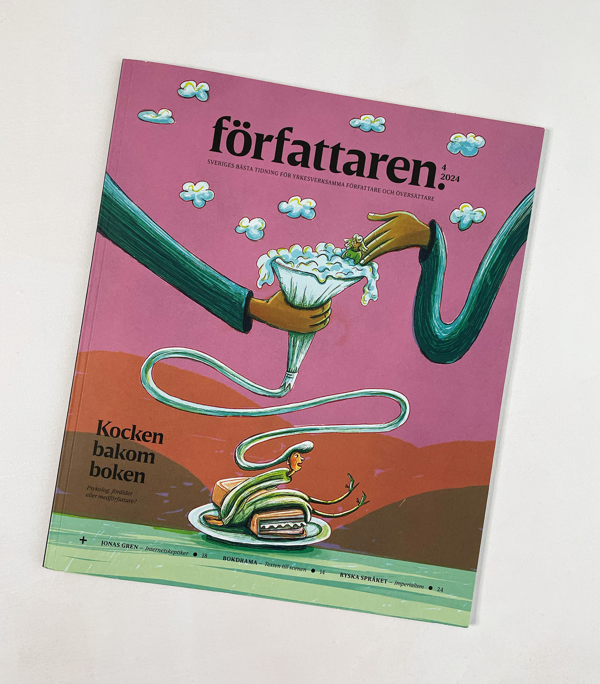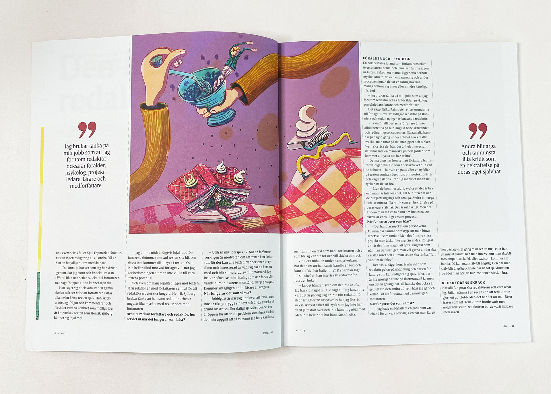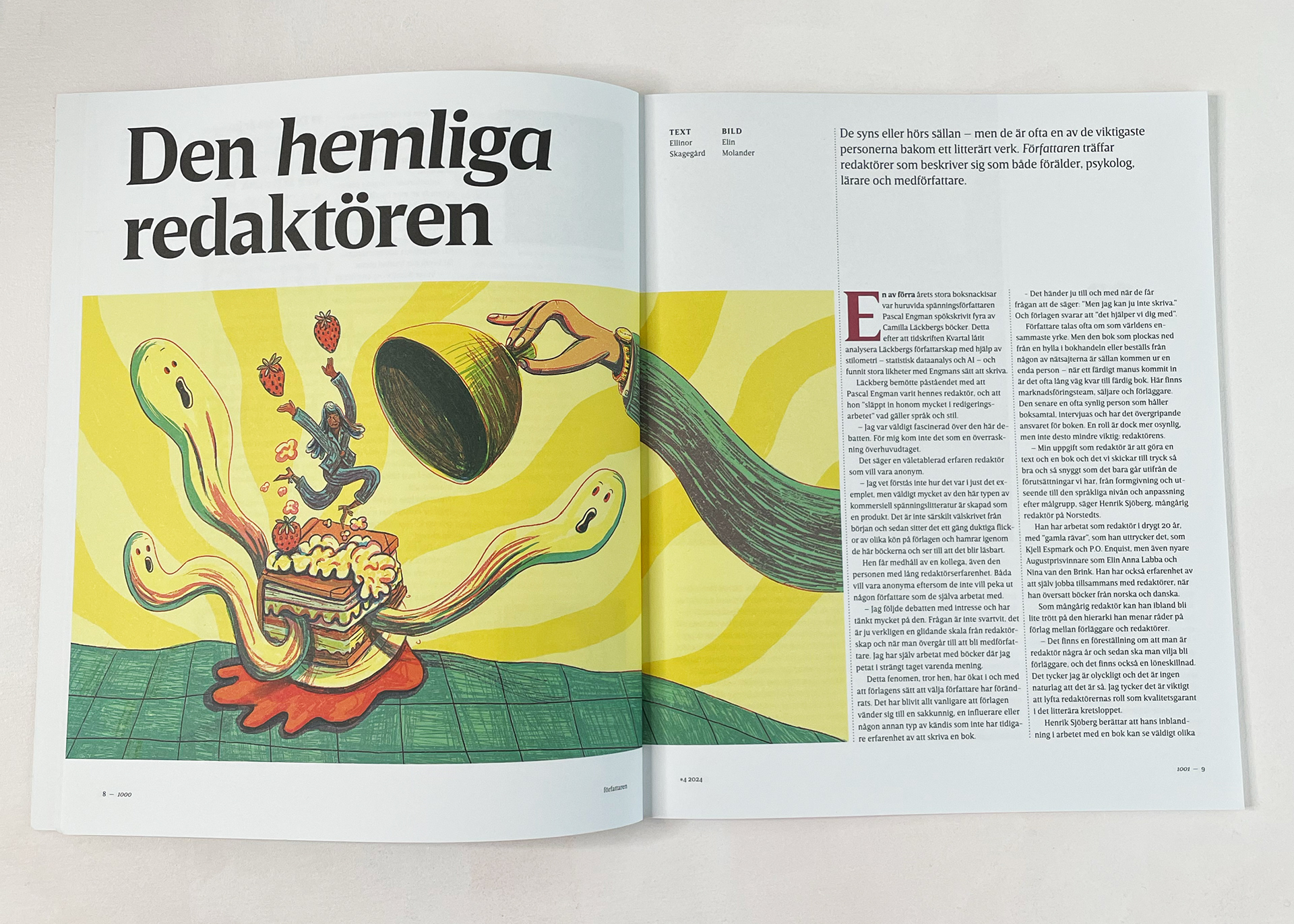 Fyra illustrationer till tidningen Författaren, illustrerar texten Den Hemliga redaktören skriven av Ellinor Skagegård.