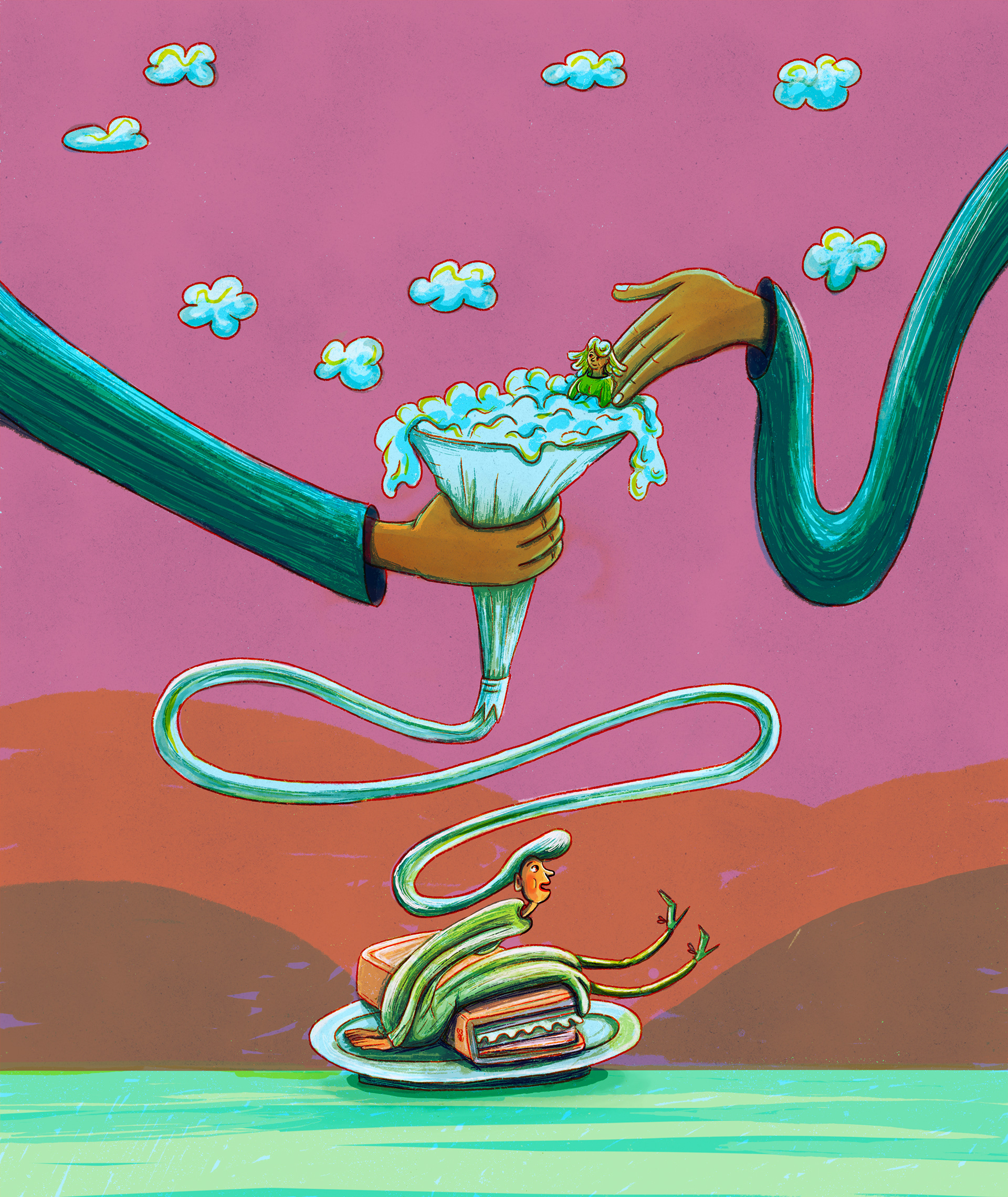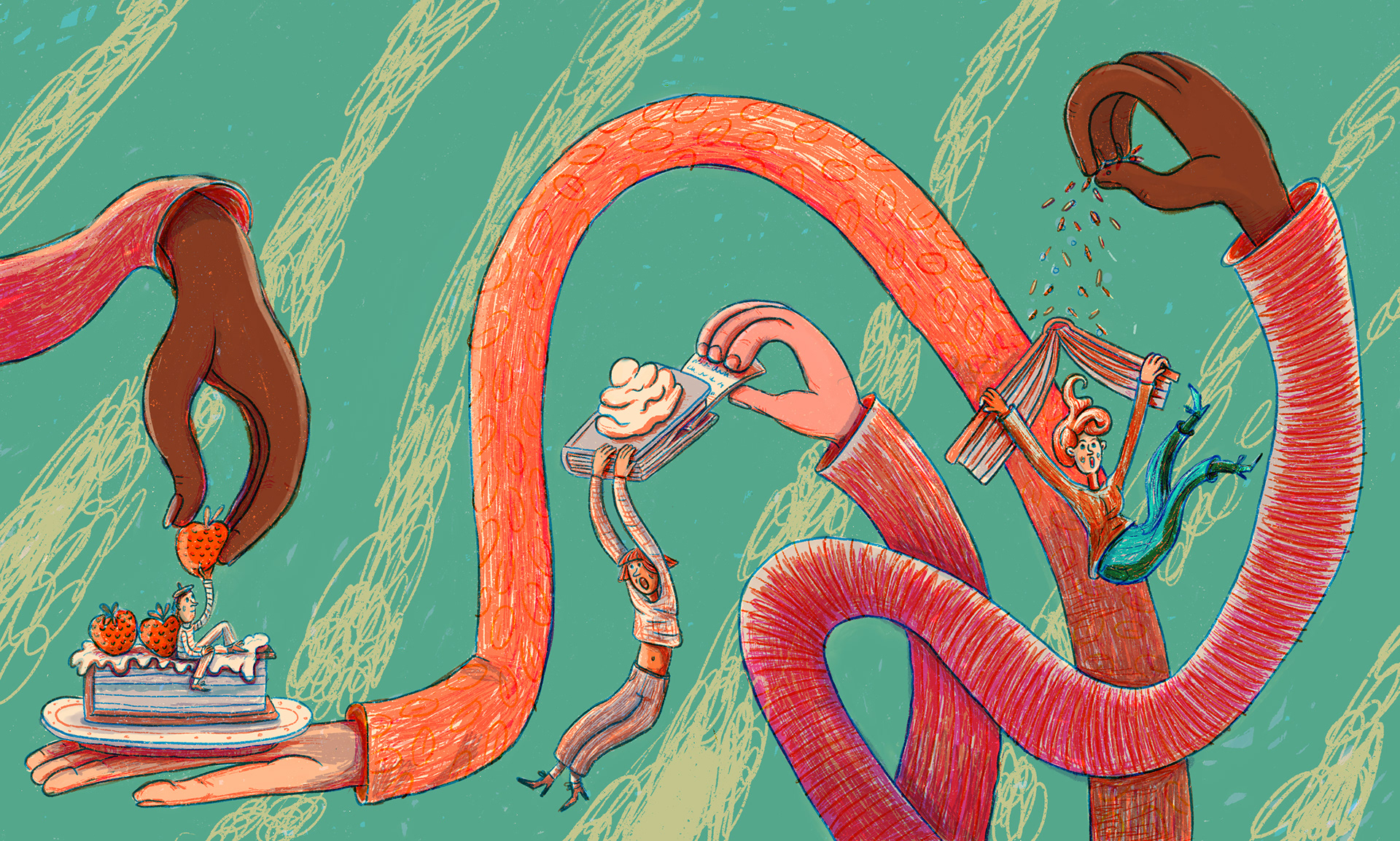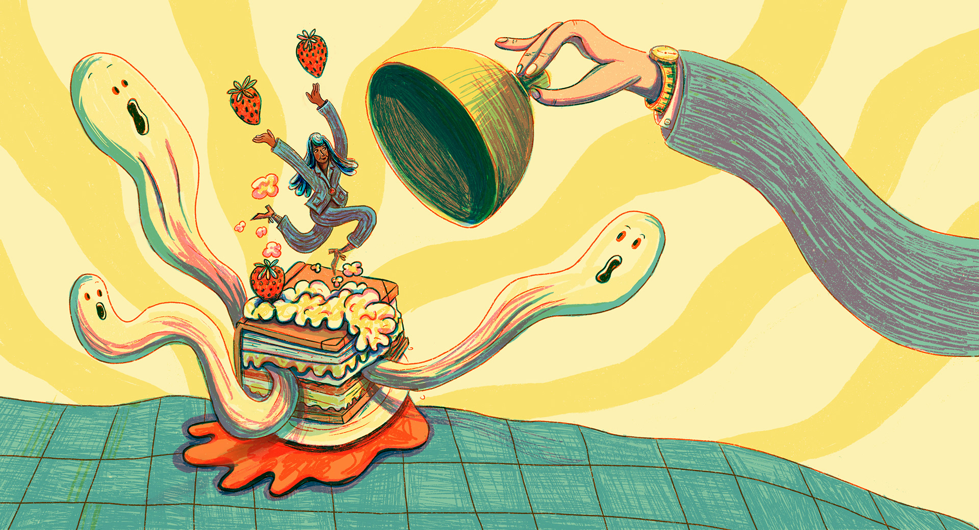 Fyra illustrationer till tidningen Författaren, illustrerar texten Den Hemliga redaktören skriven av Ellinor Skagegård.
