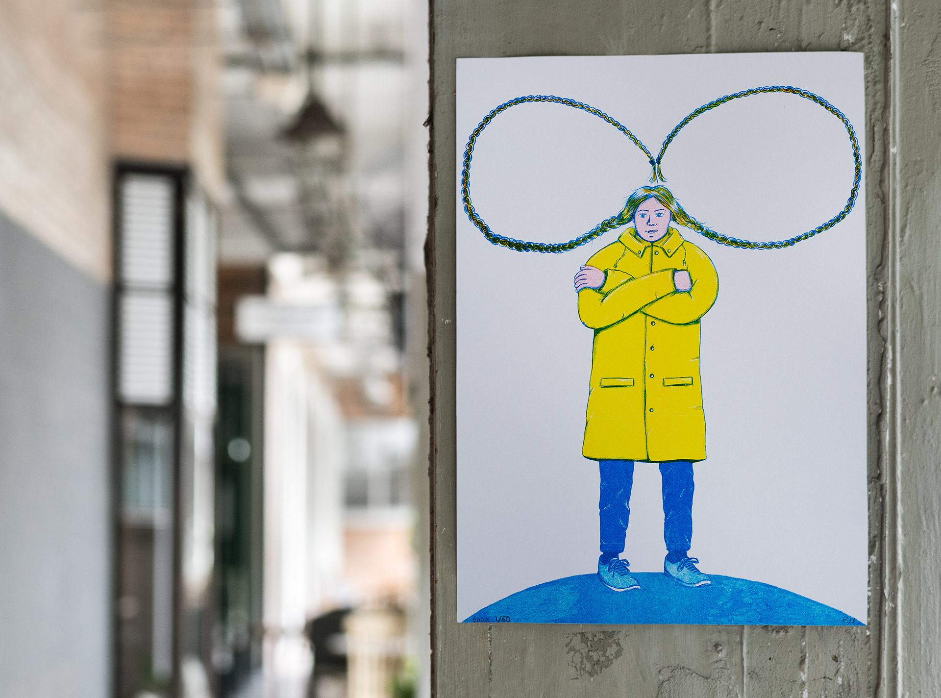 Poster of Greta Thunberg. It’s Risograf printed in a limited edition. Risograf printing is a environmental friendly print method using plant based ink.