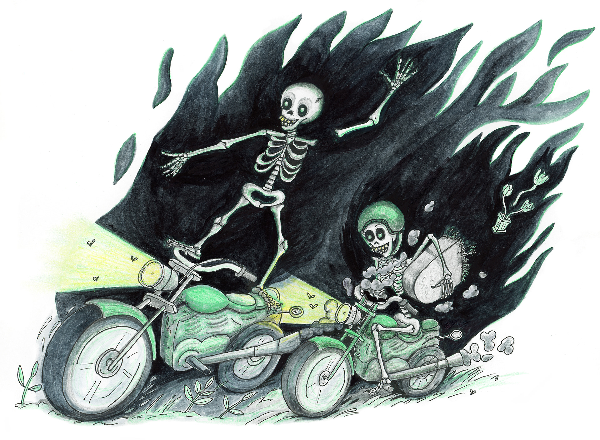 BILD TILL ORDVITSEN Två skelett steg upp ur sina gravar på kyrkogården. De gick raka vägen till parkeringen och snodde var sin motorcykel. – Vänta, sa ena skelettet. Jag ska bara hämta en grej. Han sprang in på kyrkogården igen och kom snart tillbaka med gravstenen under armen. – Vad ska du med den där till? frågade det andra skelettet. – Jag kör aldrig utan ID-kort.